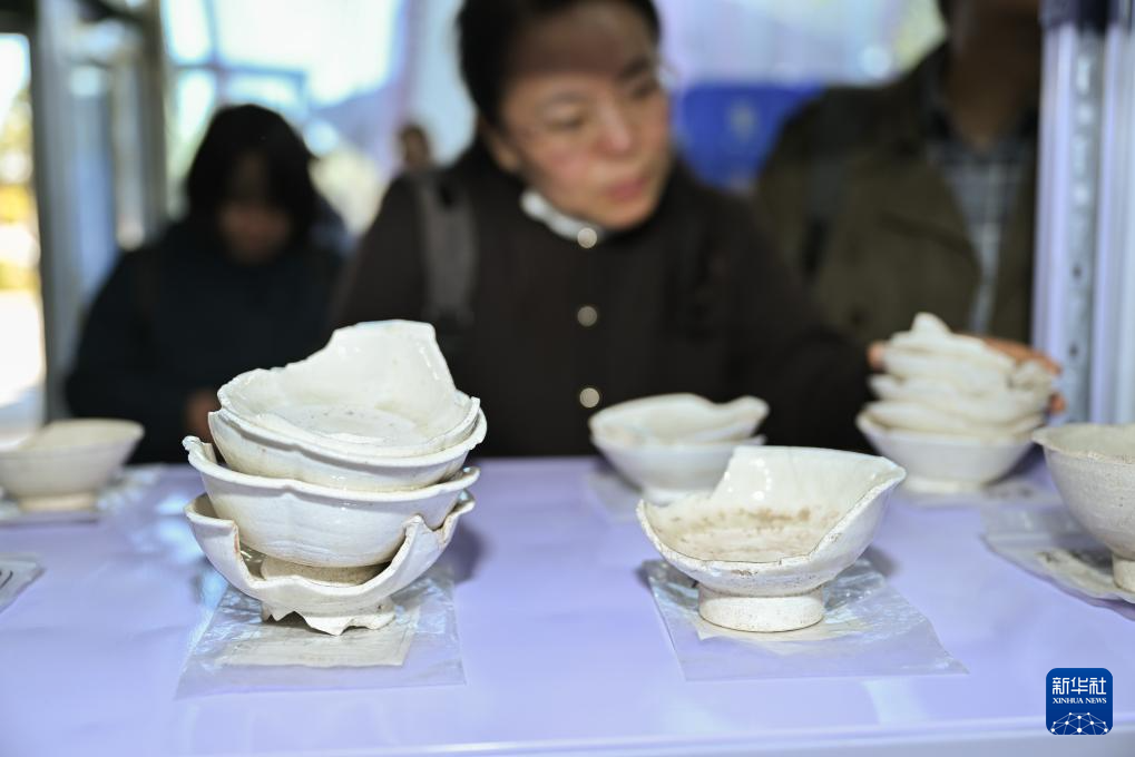在苏峪口瓷窑址考古队文物库房内摆放着大量出土的白瓷器物标本(10月13日摄)。