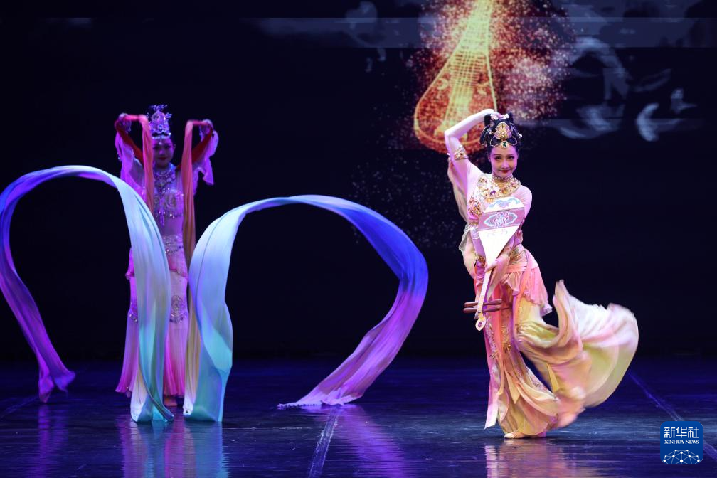 1月28日,在阿尔及利亚首都阿尔及尔举行的文艺演出上,甘肃省歌舞剧院演员表演《反弹琵琶·伎乐天》。